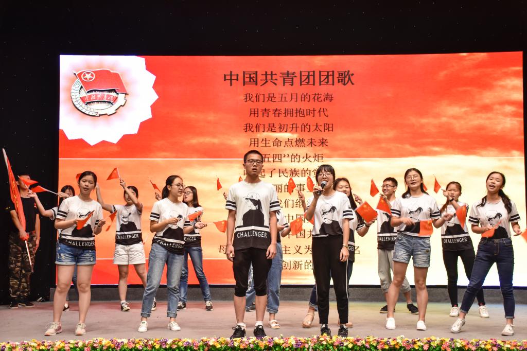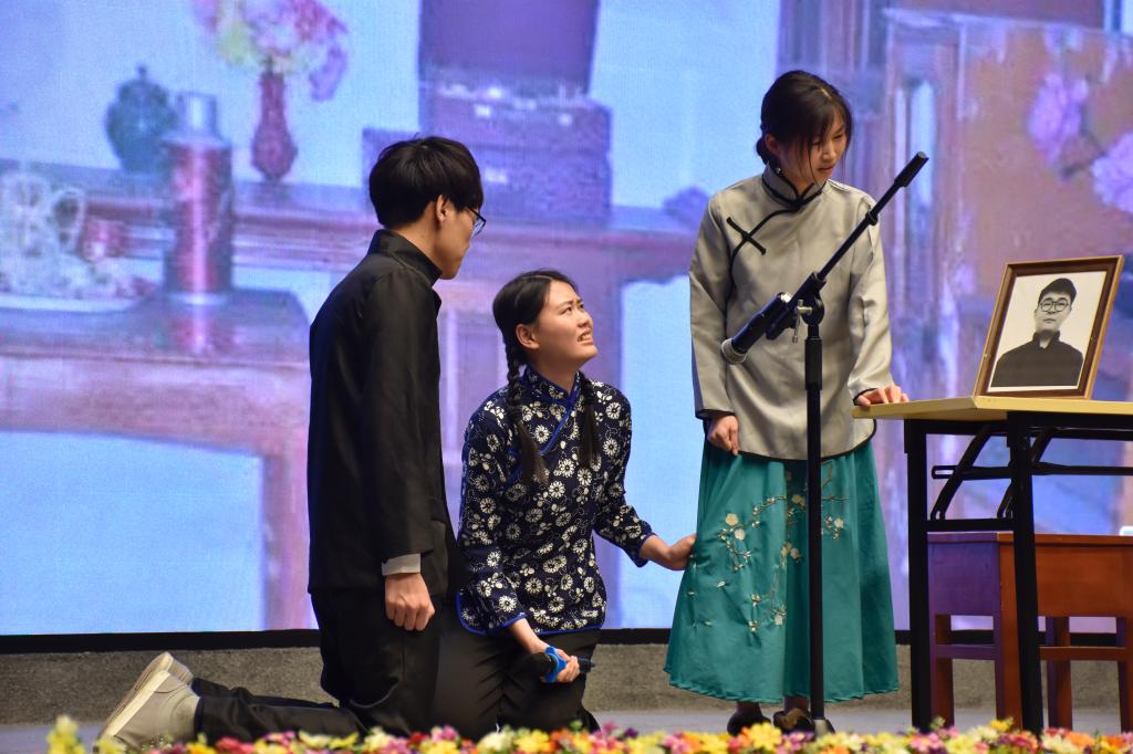 紧接着物理科学与技术学院1501团支部话剧表演《振理》紧紧围绕着爱国、进步思想主题,激励青年为国家复兴而前行,生动的表演、紧凑的剧情引人入胜,赢得现场观众的热烈掌声。支部赛的最后,教育信息技术学院1701团支部带来《红歌烩》,他们以“三句半”幽默风趣的方式解读新思想,手中挥舞鲜艳的红旗,唱出青年的声音。