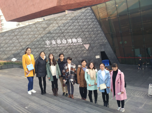 参观完军政府旧址,一行人步行来到辛亥革命博物馆进行参观。辛亥革命博物馆是为纪念辛亥革命·武昌首义100周年而兴建的一座专题博物馆,馆内设有1个序厅、5个基本陈列展厅和1个多功能展厅,集陈列展示、文物收藏、宣传教育与科学研究等功能于一体,是现有辛亥革命专题博物馆中展览规模最大、陈列科技含量最高、复原场景最多、参观导览系统最全的博物馆。图为全体成员在博物馆前合影。