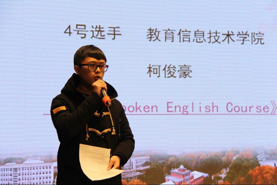 本次比赛的十四名参赛选手被分成三个小组,评委老师在每一小组的选手展示结束后对该组选手的表现做出评审。第一小组的4号选手柯俊豪、5号选手李国豪皆为我院2013级学生。4号选手柯俊豪以“让英语进入生活”为其本次微课设计的宗旨,针对目前很多大学生在校学习的英语为“Literary English”而非“Spoken English”的问题,设计了以幽默剧情的短视频为主线的英语教学微课程,他制作的视频贴近人们的日常生活,气氛轻松活泼,分段合理,赢得了在场观众的激烈掌声。在最后的总结中,柯俊豪表示,希望学习者通过对视频的观看,循序渐进地对视频内容的重点语句进行理解,加深学习者对所学内容的印象,打破“哑巴英语”的魔咒,提升英语口语能力,培养出开口说英语的习惯。“别出心裁的教学流程、引人入胜的视频制作、目标明确的设计理念,真的是让人眼前一亮!”在场的一位观众在看完柯俊豪的展示后这样说到。