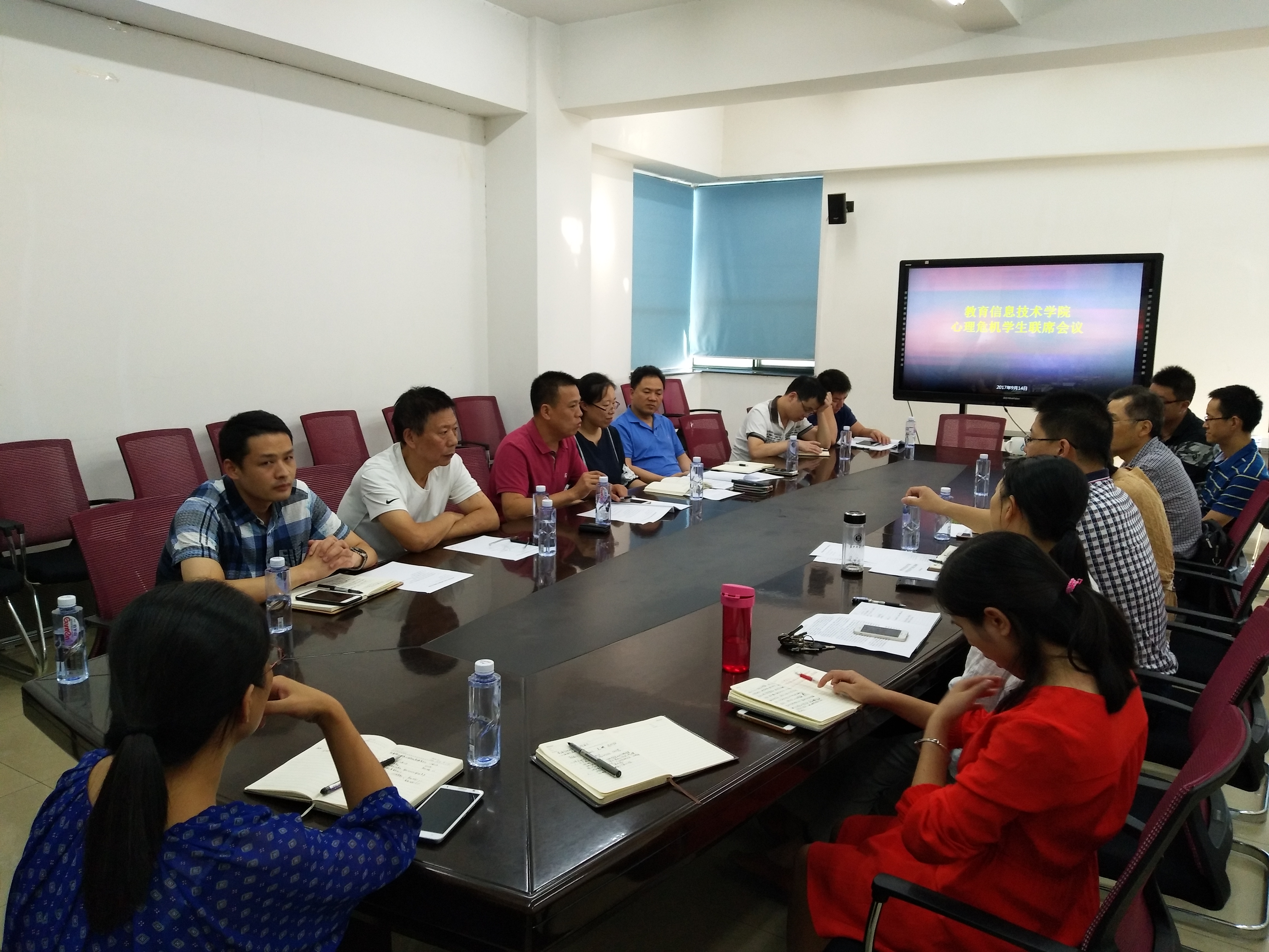 为深入贯彻落实全国高校思想政治工作会议精神,切实做好我院学生心理危机预防与干预工作,提升各类教师对心理危机学生的识别和干预能力,确保校园安全稳定,9月15日下午,我院在9625会议室召开了2017年度心理危机学生联席会议。学工部副部长王东爽、研工部刘卫老师、大学生心理健康教育中心副主任吴才智、于丽霞老师、教育信息技术学院学院党委书游丽、副书记钟文锐出席会议,学院全体本科、研究生专兼职辅导员、班主任参加了本次会议。会议由钟文锐主持。