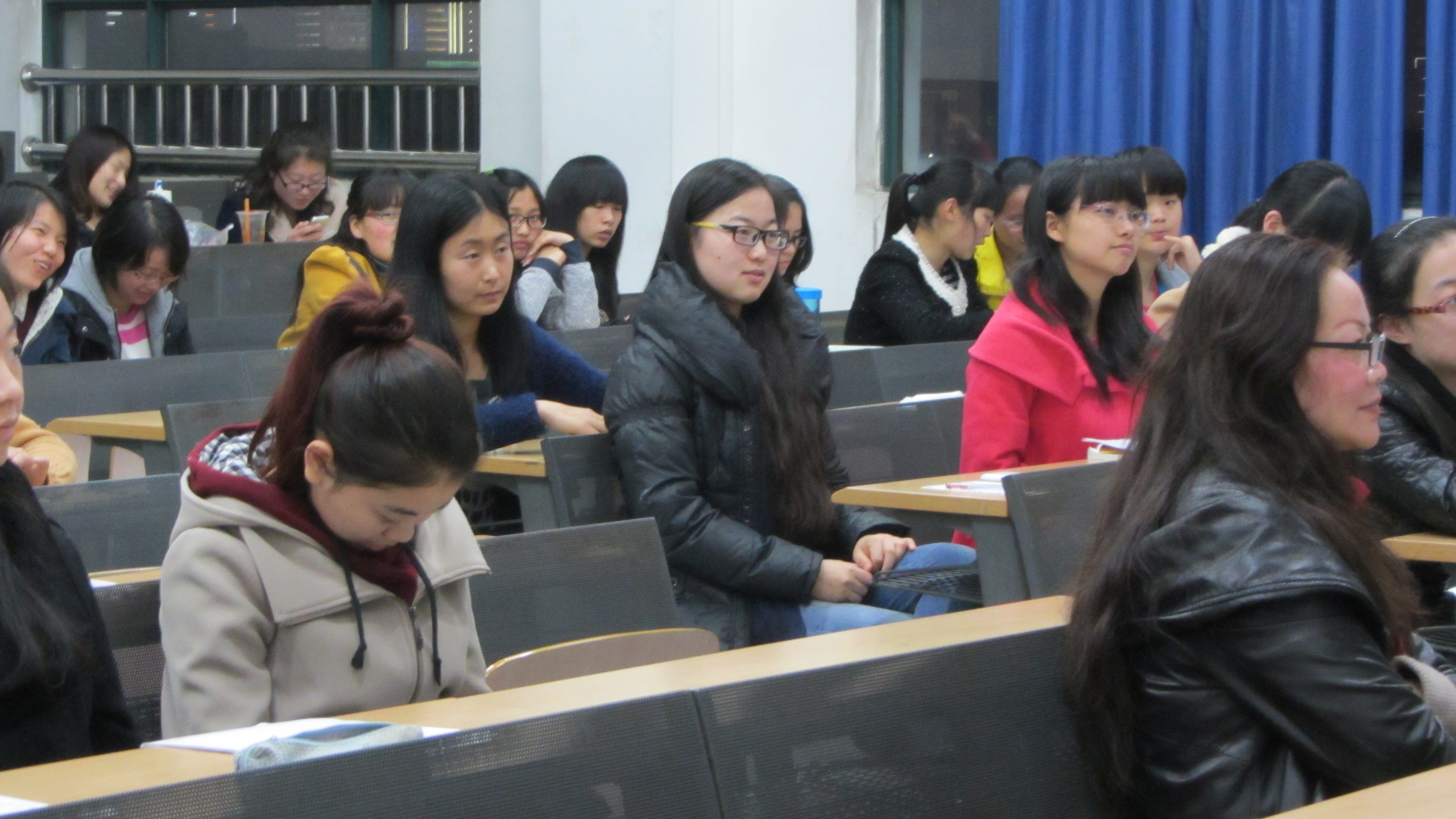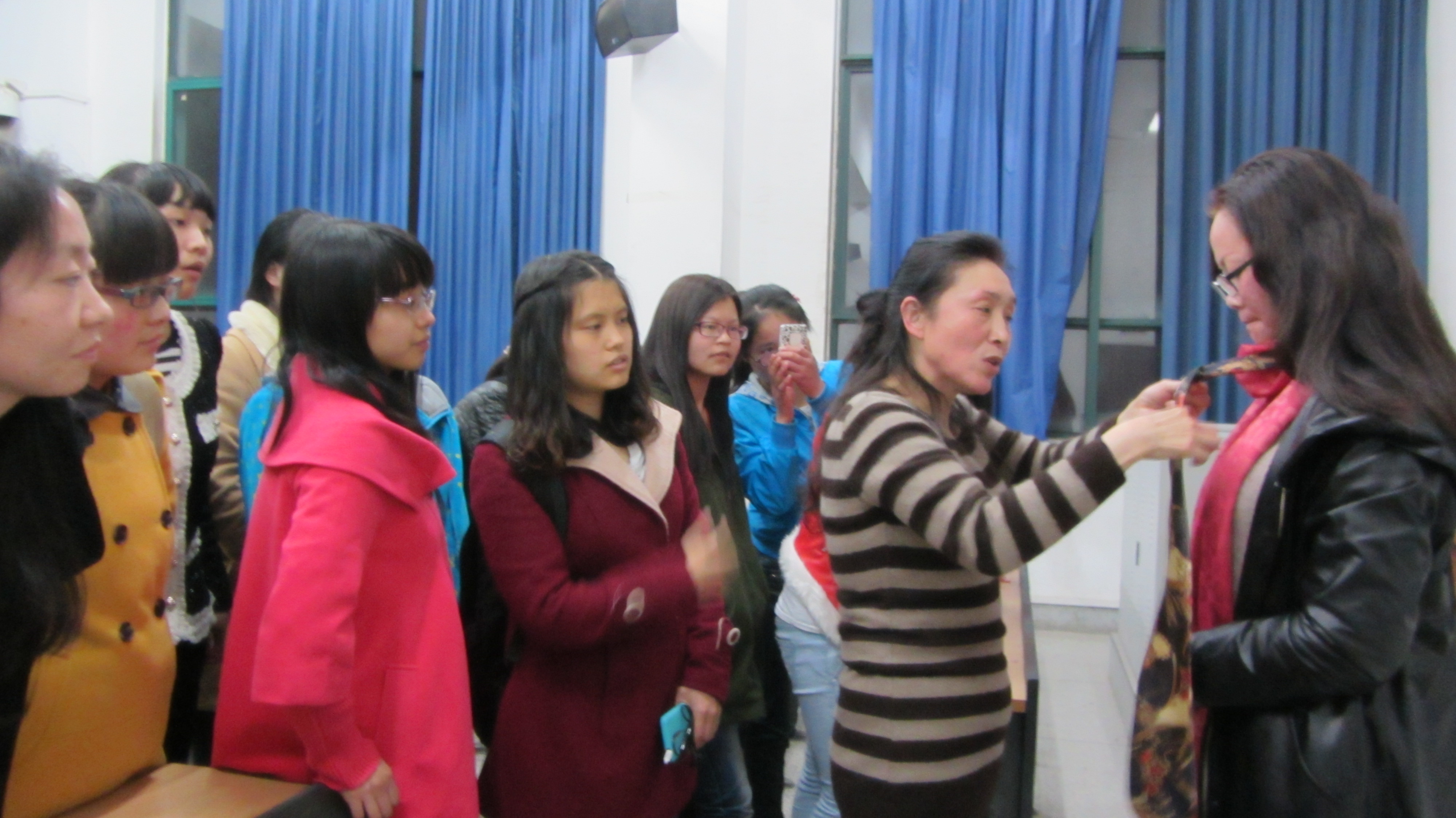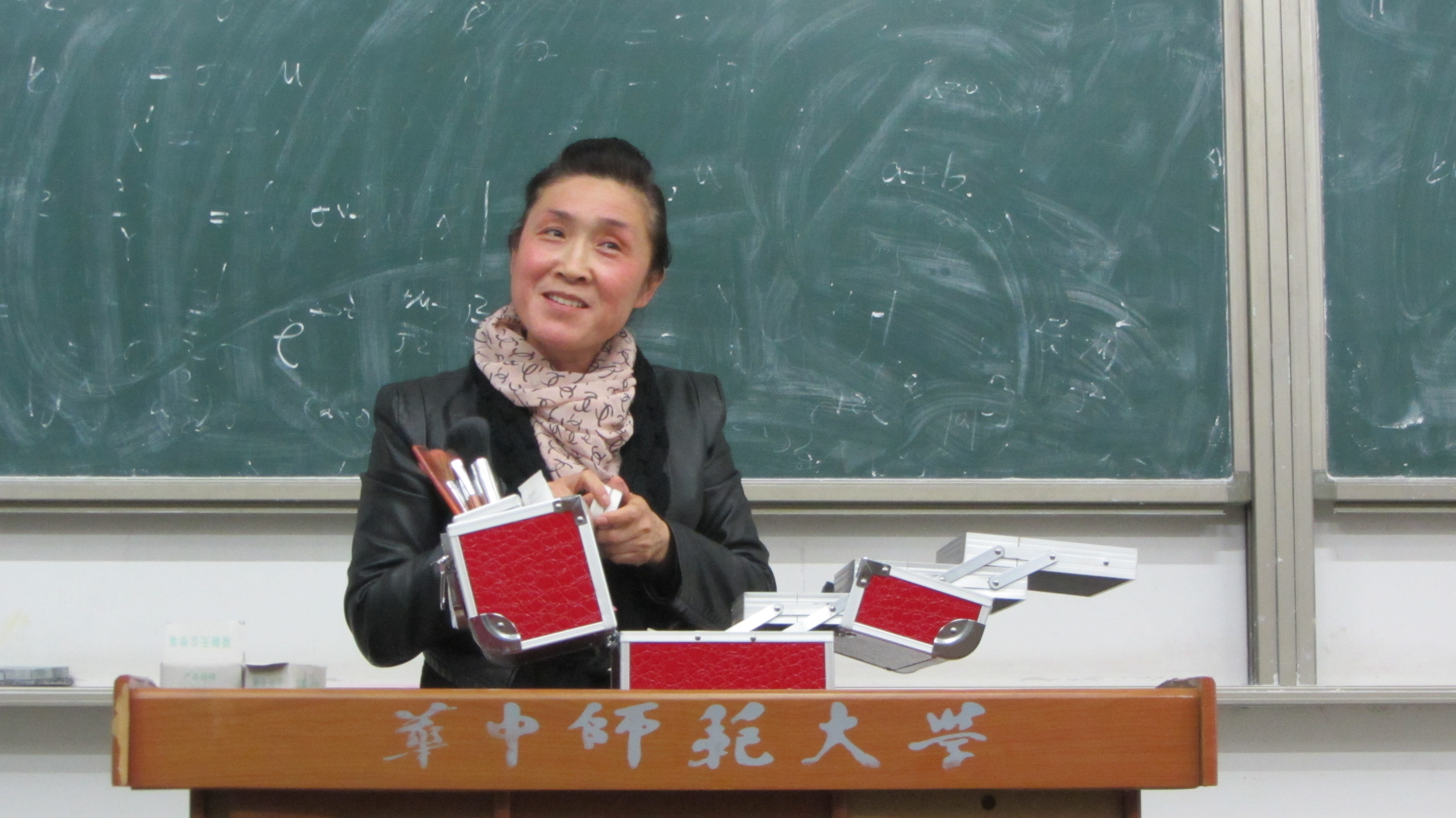 随后,张付萍开始讲座,张老师首先询问学生想听哪方面的,在收集到答案“化淡妆”“穿衣搭配”“减肥”等几项提议后,张老师便开始要同学观察自己的坐姿,并且强调:“一个人的气质就看他的坐姿站姿,如果一个人站的懒散坐的松垮,那化再好的妆也不好看。”随后向同学们讲述站坐姿的相关知识,随后张老师讲淡妆的画法,“刷睫毛的时候,眼睛要看下面,从根部开始刷,腮红不仅仅只可以打脸上,下巴打一些会使下巴更饱满,脸的轮廓也出来了。”张老师一边演示一边说道,同学们听得十分认真。